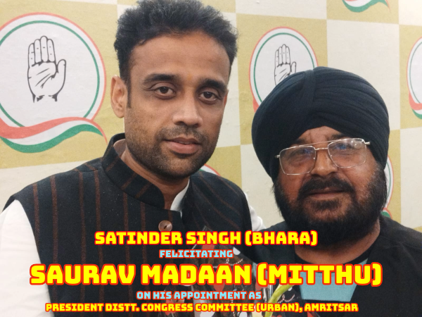 सौरव मदान को जिला कांग्रेस कमेटी (शहरी) अमृतसर के अध्यक्ष बनने पर एक बार फिर बधाई। हमें उम्मीद है कि उनके नेतृत्व में पार्टी शहरी क्षेत्र में और मजबूत होगी और जनता के मुद्दों पर प्रभावी ढंग से काम करेगी।